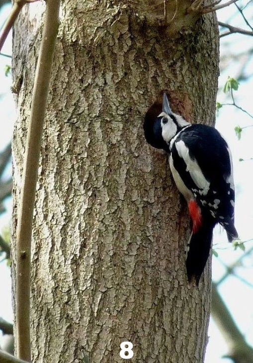 Both birds dug the hole. First digging deeper and deeper from the outside (pics 3/4/5), then getting inside and flinging out the chips of wood (pic 6). The chips, up to 2cm. long, built up under the tree (pic 7). The woodpeckers were seen mating.