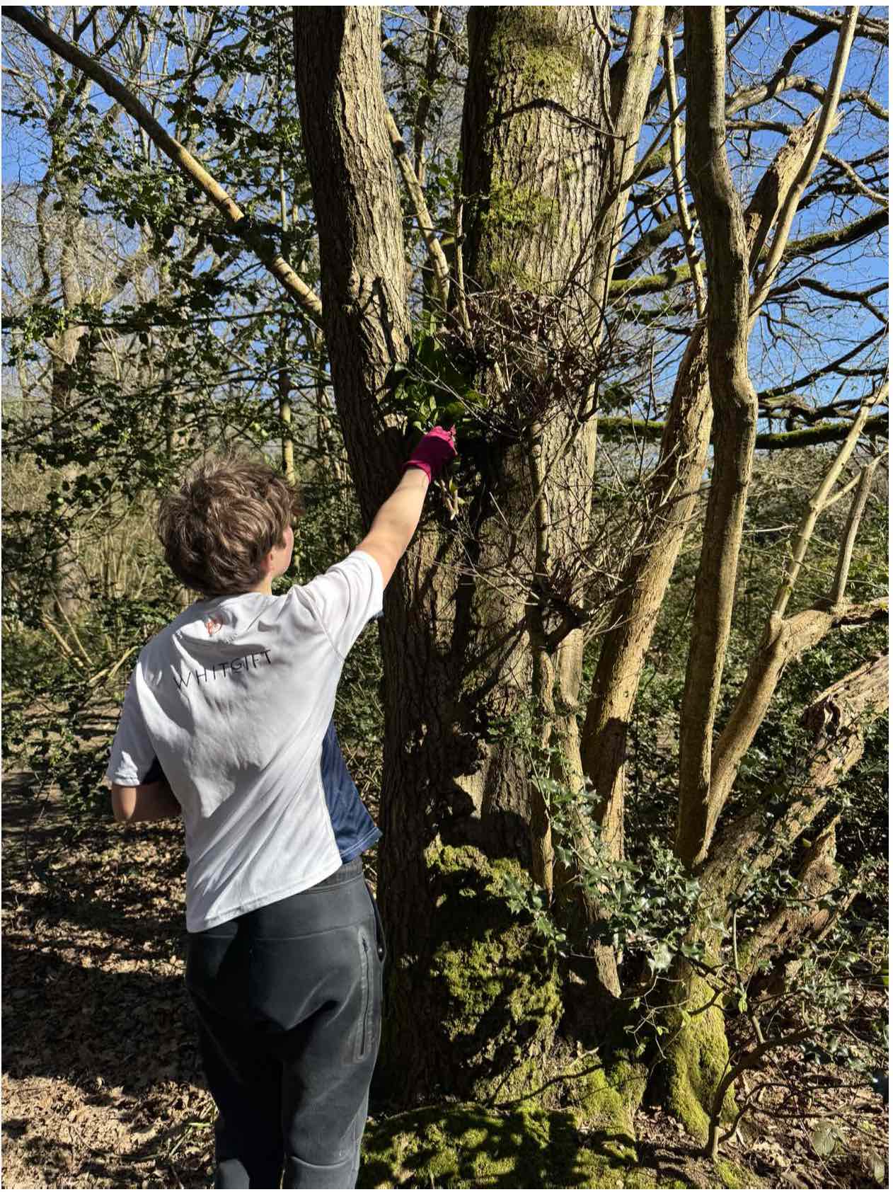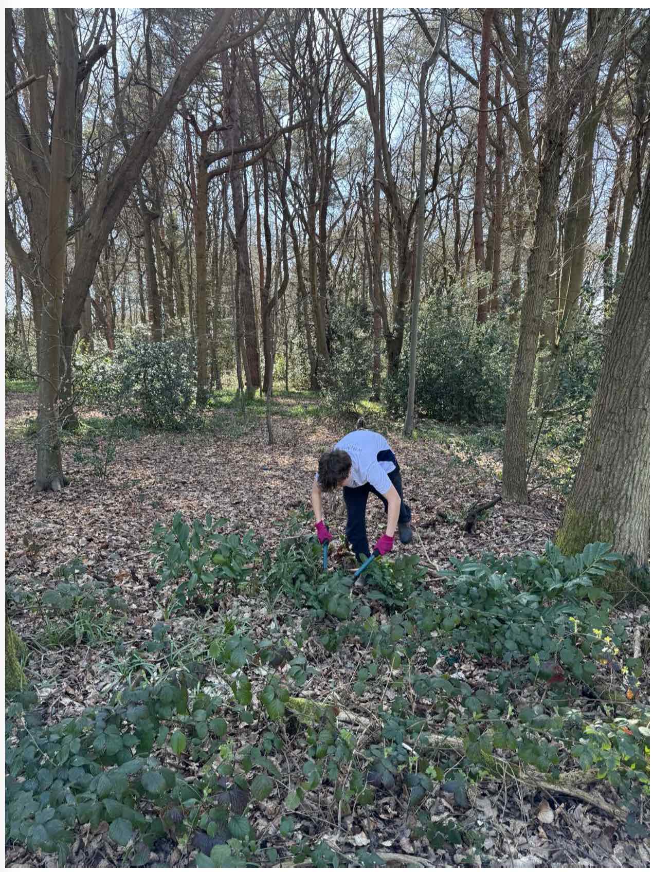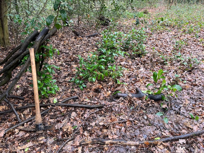 Rahul, Joshua and Daniel with their carers Emma and Charlotte helped us locate the shoots appearing amongst the carpet of dead leaves and Bluebells in the area of the large Laurel cleared off Greenhill Way last year. We pulled up many and Linda also treated exposed cut branches and roots to prevent further re growthJim was able to cut down the several stems of one, whilst Linda and Daniel tackled the other. Rahul and Joshua, with their carers, found shoots to pull up and helped clear and pile up over a fallen trunk and bed of dead wood the thinner branches we could remove in the time available.