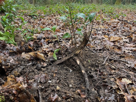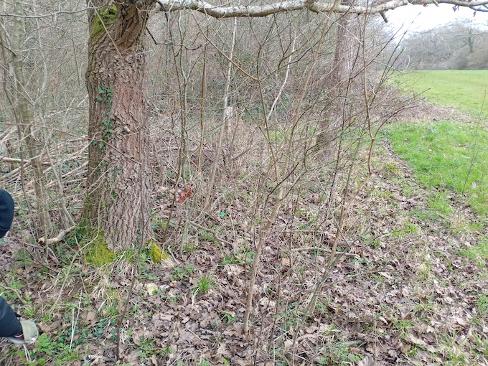 By the end of the work period we had cleared about one third of the area, so there is more back-breaking work required to clear the remaining two thirds. Some tiny trees were left for later identification and it is probable that some of the larger trees will require removal of lower branches. We found many Ash seedlings growing up through two “habitat” piles which were left in the middle of the area last year. Controlling the seedlings really requires cutting them close to ground level so moving the piles to the dead hedge would be a useful first step. This would retain the “habitat” aspect of the cut material for insects and creepy-crawlies, and allow the centre of the area to be used for growing other plants e.g. orchids.