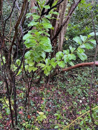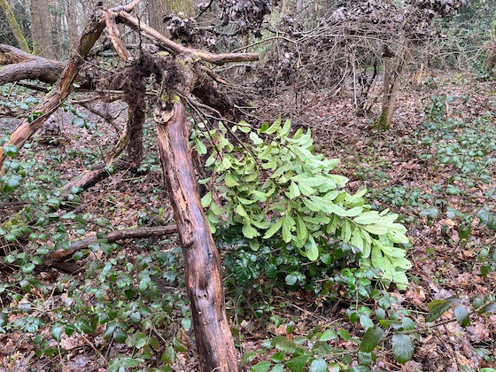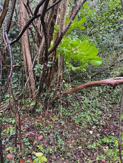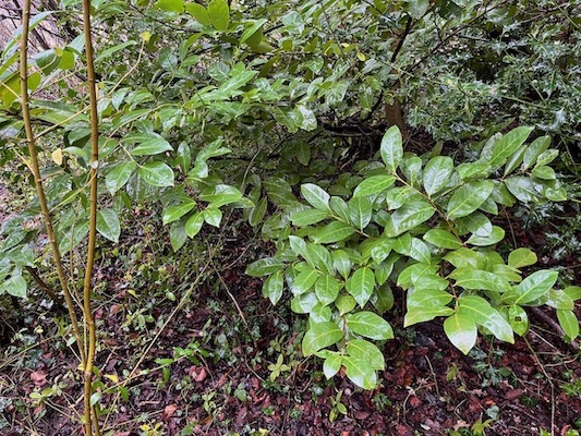 She and Jim were unable to locate what she thought she had identified as a Laurel when walking up Old Farleigh Road alongside this woodland section as it was very difficult to penetrate.