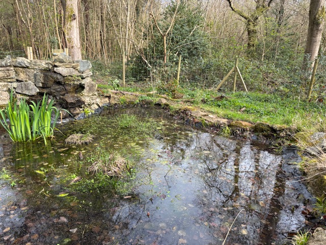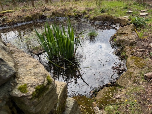 I was disappointed to see it seems as though someone has added pond weed to the pool despite us making it clear we didn't want it - and nothing added without our permission. Some of the plants I bought last year for the 'islands' were deliberately chosen as oxygenators so the weed is unnecessary and will eventually choke the planned planting. I managed to drag some out today with some sticks but couldn't reach far without wading in. I didn't risk doing that as I guess the base is quite slippery now!