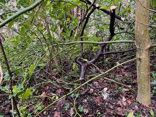 With equipment in one trolley we followed Vale Border to Field 3 then crossed diagonally to enter the short leg of Great Field. Small and large Laurels were removed in Stevens Larch, Langford’s Way and Avis Grove. In Avis Grove a very large multi-stemmed Laurel was cut down. Where possible cuttings were hung up to prevent re-rooting.report from Valerie